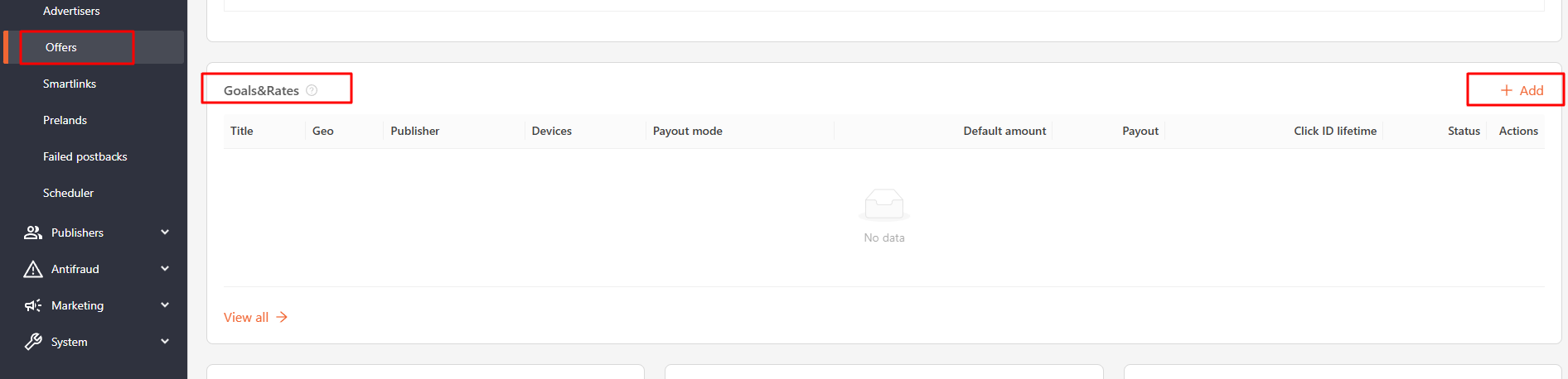 To set up a goal, navigate to the Offers > Specific Offer > Goals&Rates tab and click "Add" button