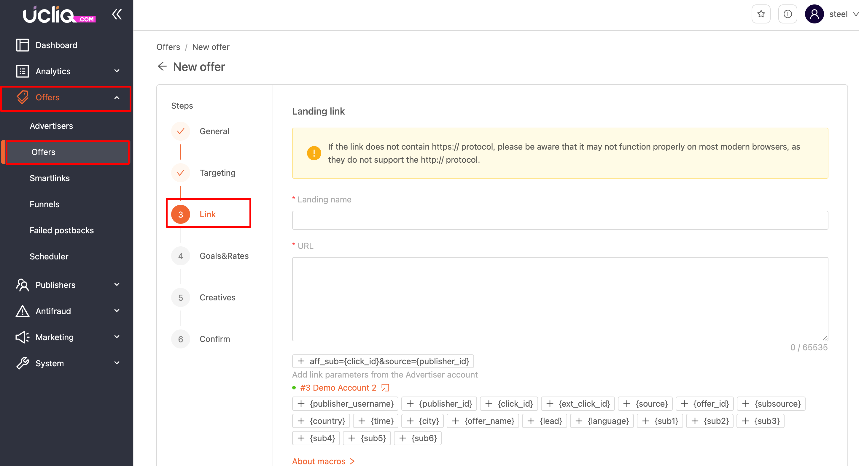 Go to the Offers > Specific offer > Links and add the advertiser tracking link. It will contain parameters to which you need to add matching macros (e.g., {click_id}, {source}).