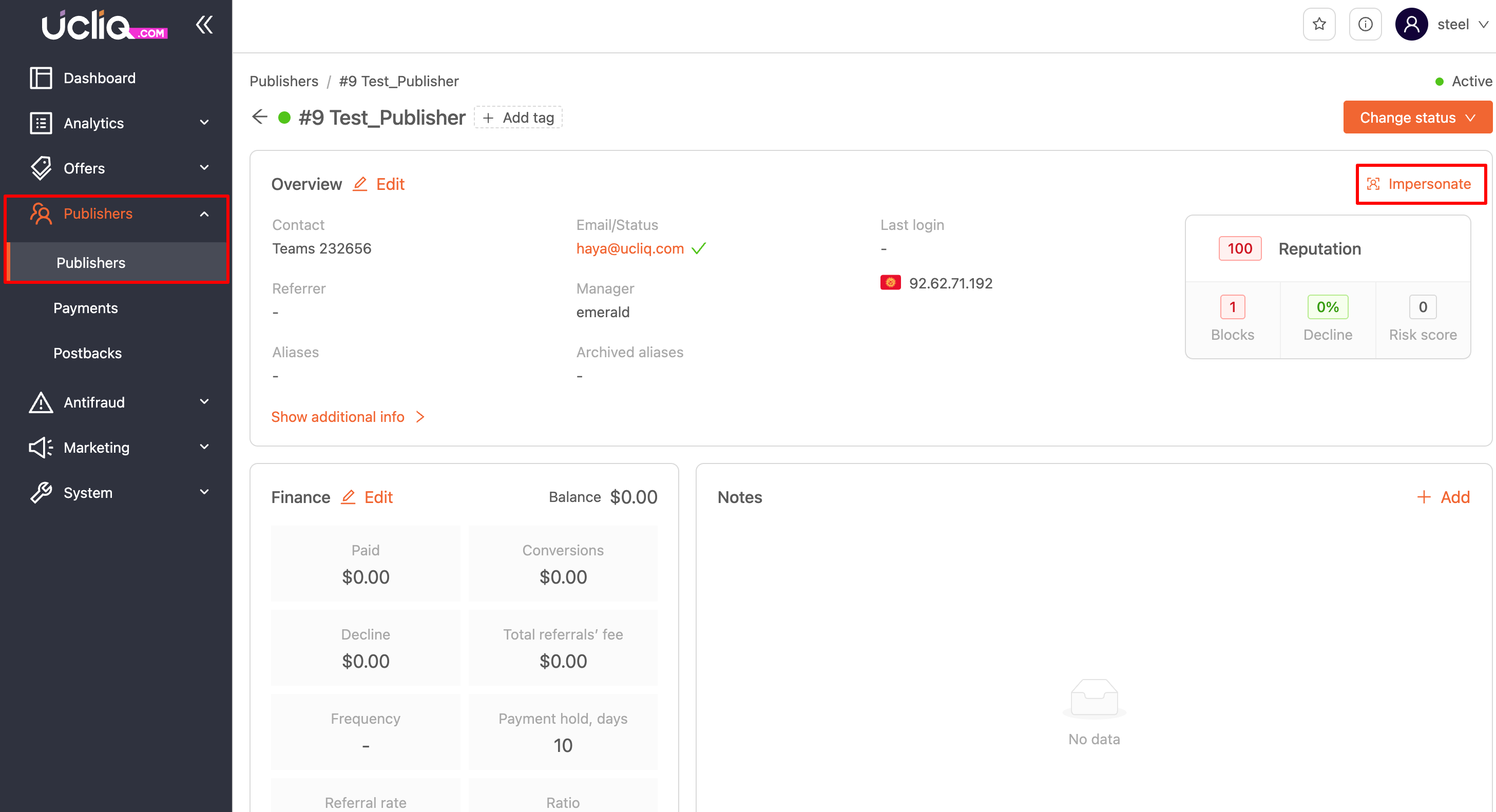 Publisher Panel: This is for your publishers, where they can track their performance, access offers, and generate tracking links. It's for affiliates and traffic managers. Go to the Publishers > Specific publisher > Impresonate to open the Publisher panel: