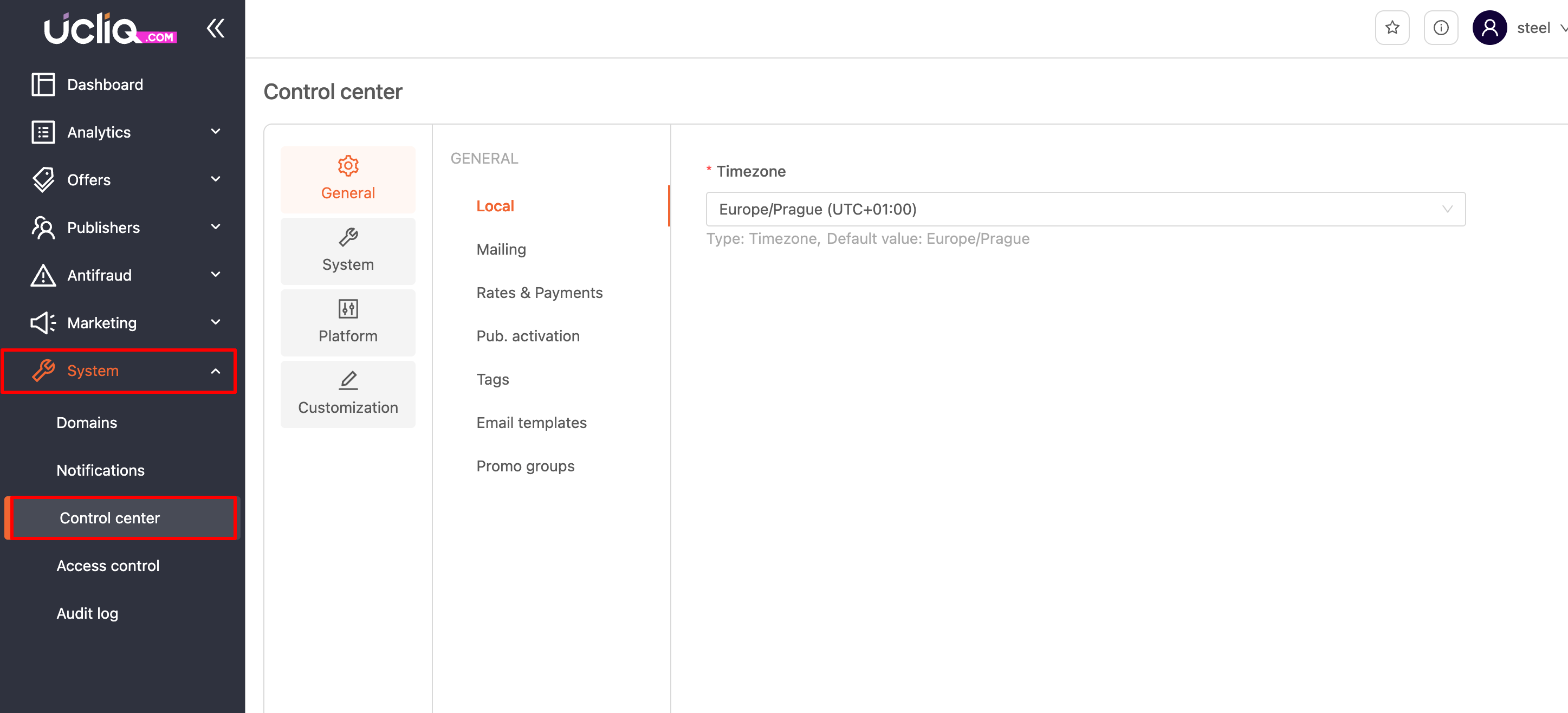 Navigate to the System > Control Center >General.