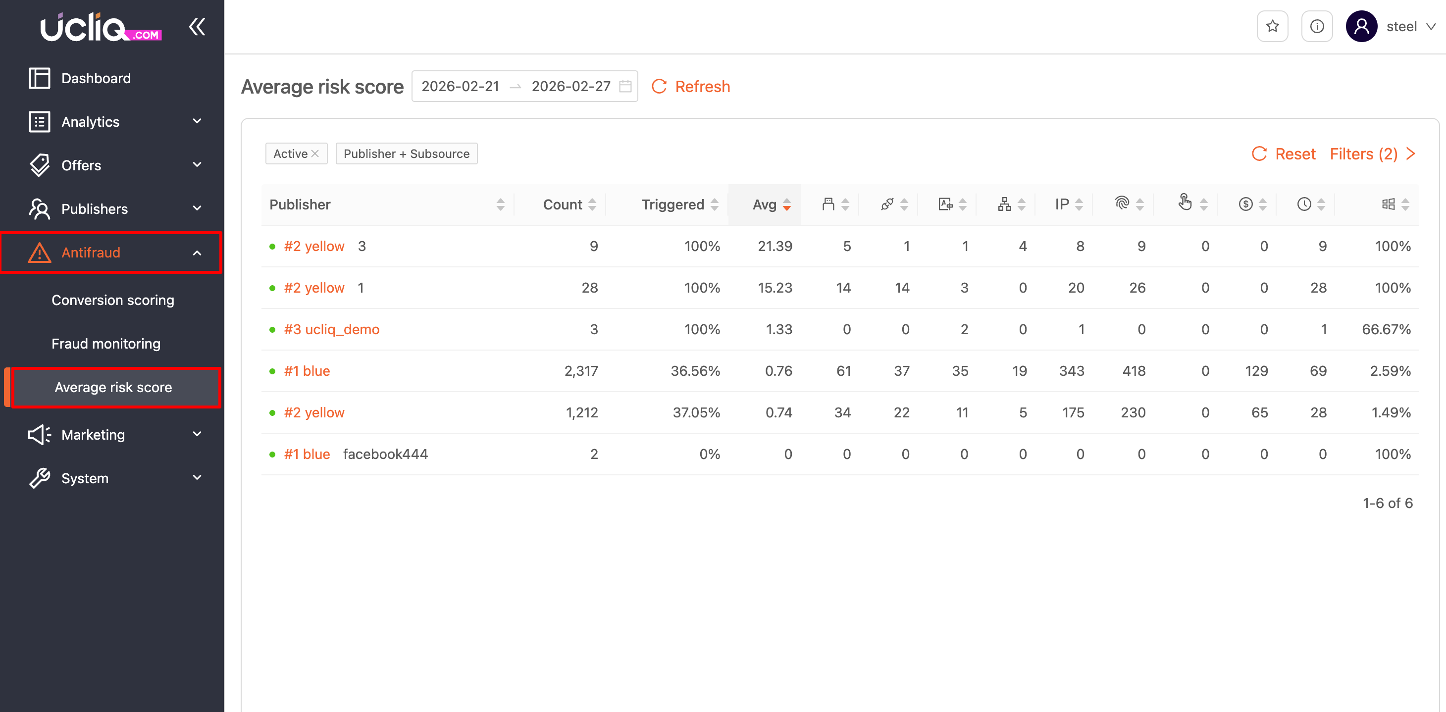The Average risk score feature helps you understand if the traffic coming from a publisher looks suspicious or not. The system shows how often risky patterns were detected, how serious they are, and gives you a clear overview of each publisher’s traffic quality.