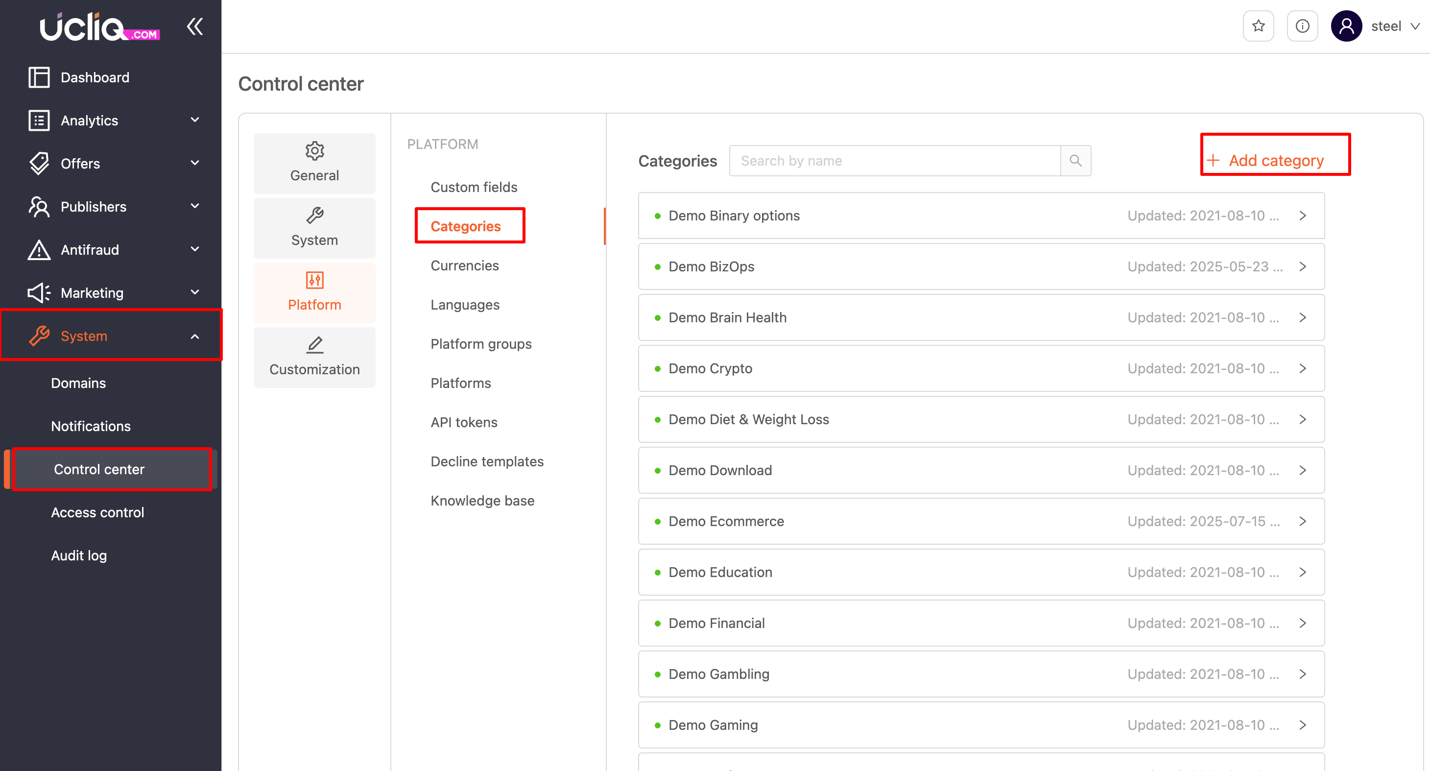 Categories in UCLIQ are used to organize and group offers and smartlinks by topic or industry — for example, Finance, Gambling, Health, etc. They help in: