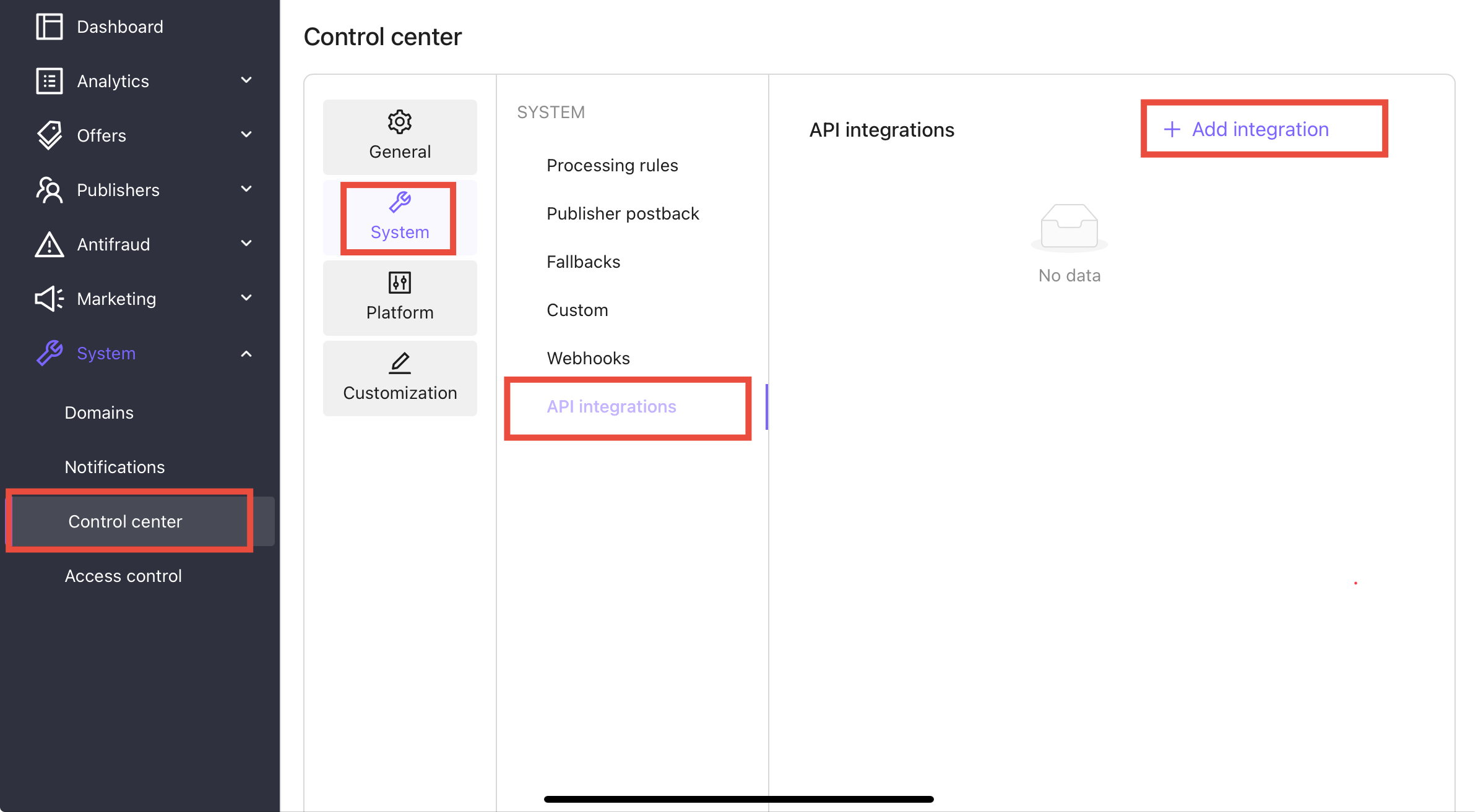 Navigate to Control Center > Integrations. Click + Add Integration. Select the Advertiser account you created in Step 1. Enter the API credentials (API key, endpoint URL, etc.) provided by the external platform. Select a default category for imported offers. Save the integration.