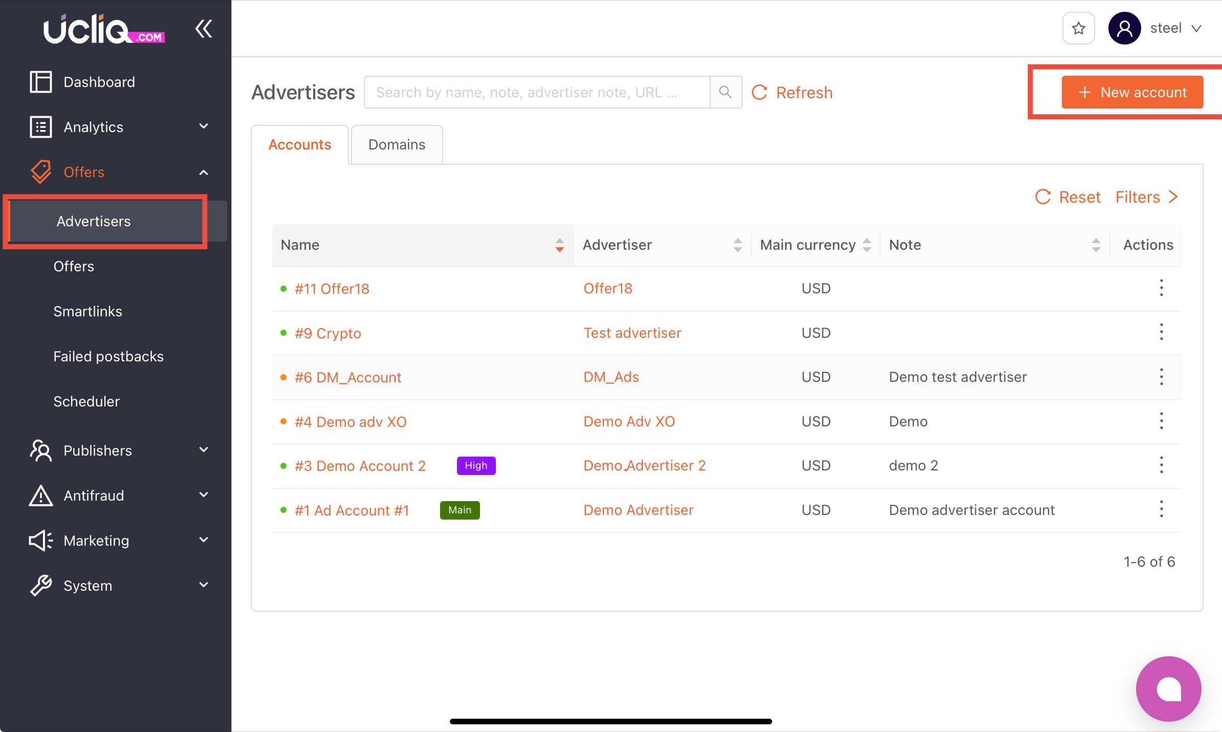 Go to Offers > Advertisers. Create a new Advertiser account that matches the advertiser in the external platform. This account will serve as the link between UCLIQ and the external system.