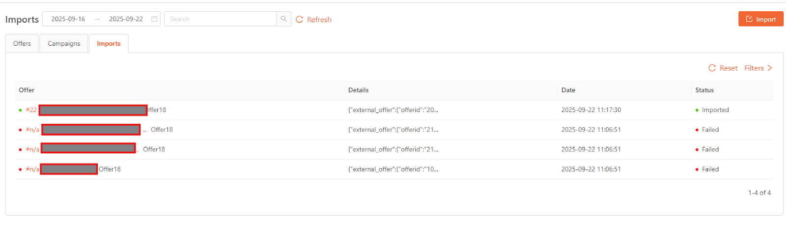 Imported - already imported offer (can be imported again, to update changed tracking link/adv.link, targeting, name)