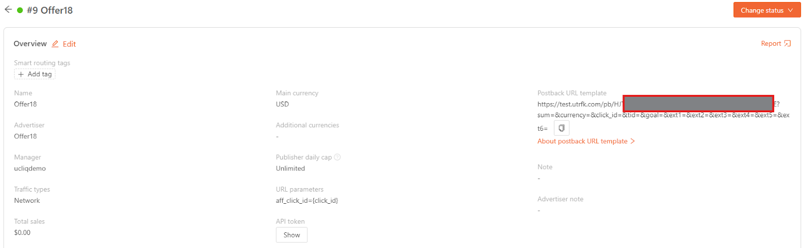 Copy the Postback URL template and replace the parameter=value pair for click id with the parameter used in URL templates to pass UCLIQ’s click id to as well as other parameters such as payout, currency, etc.