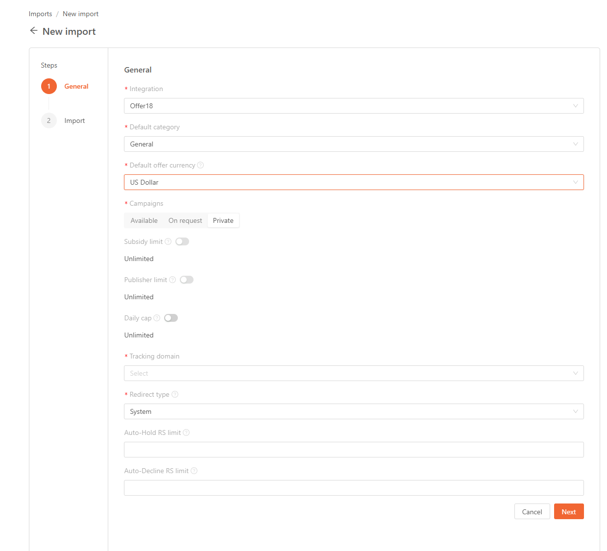 Select the integration you created at the previous step and populate the fields for the new offers to be imported. Make sure you select a valid tracking domain for the offer.