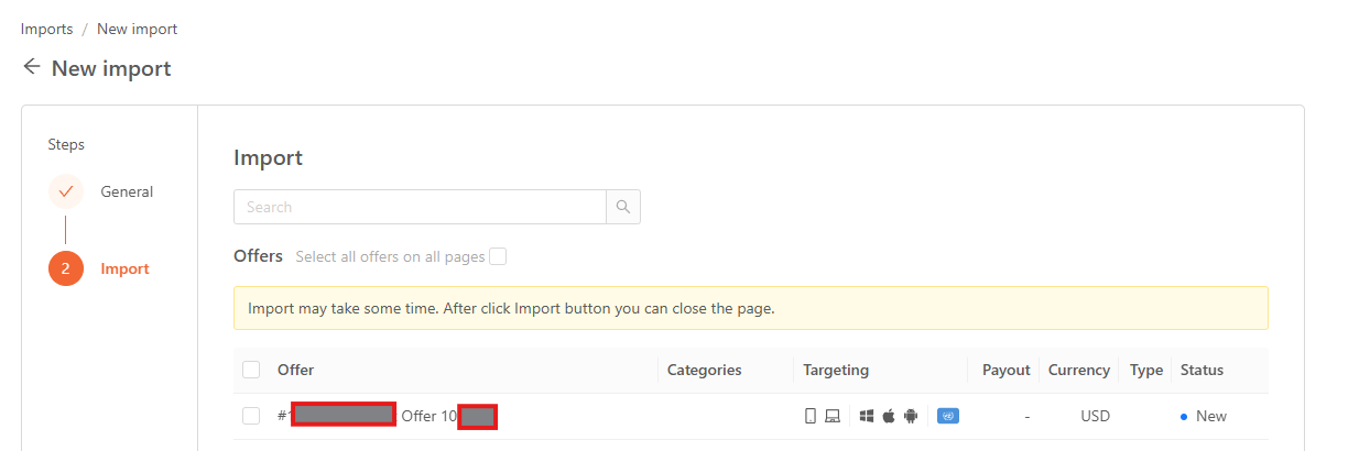 The page will load all available offers for the import, including their names, Categories, Targeting data, payout (if configured), Currency, Type and Status.