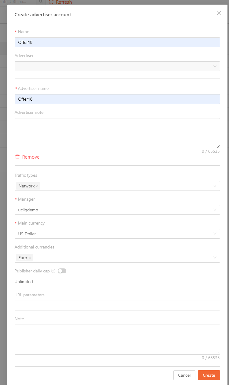 Create a new advertiser account (and a new advertiser if necessary) in Offers > Advertisers menu section.