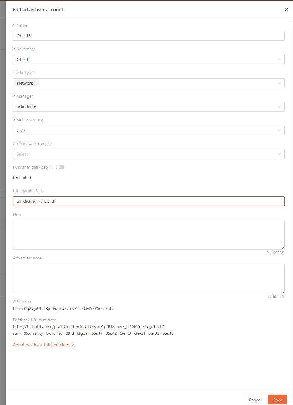 Copy the advertiser postback template from your newly created advertiser account and add the click id parameter macro used to pass the UCLIQ click id.