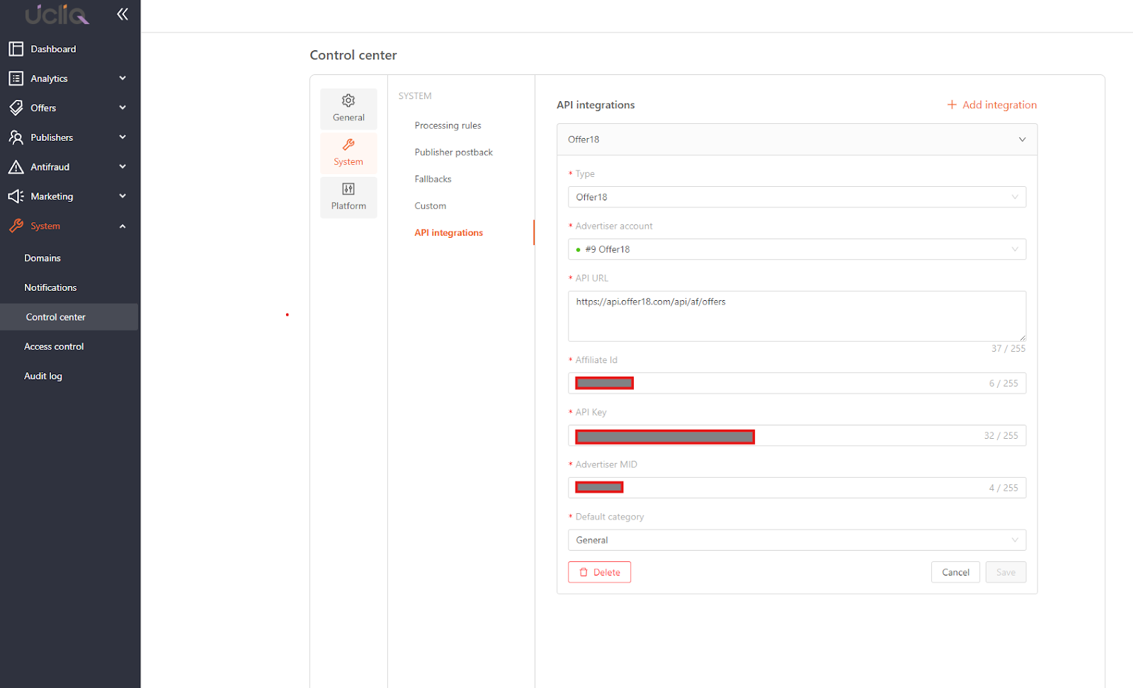 Select the integration type, advertiser account you have created at Step 1, put the API URL and other parameters provided to you by the Advertiser (or found in the platform), and select a Default category for new offers. Click Save.